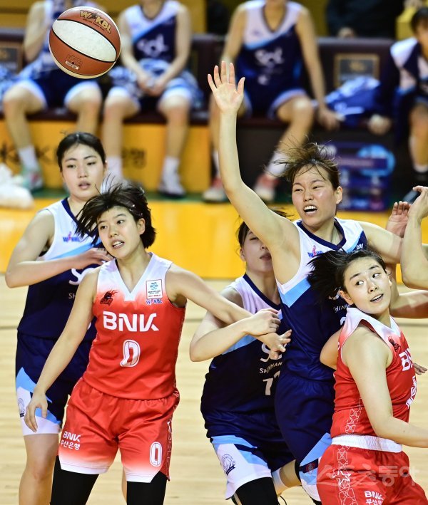20일 충북 청주체육관에서 열린 ‘삼성생명 2021-2022 여자프로농구 퓨처스리그’ 인천 신한은행과 부산 BNK 썸의 경기에서 양 팀 선수들이 루즈볼을 바라보고 있다.