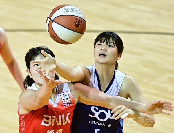 20일 충북 청주체육관에서 열린 ‘삼성생명 2021-2022 여자프로농구 퓨처스리그’ 인천 신한은행과 부산 BNK 썸의 경기에서 BNK 썸 문지영과 신한은행 변소정이 루즈볼을 향해 손을 뻗고 있다.