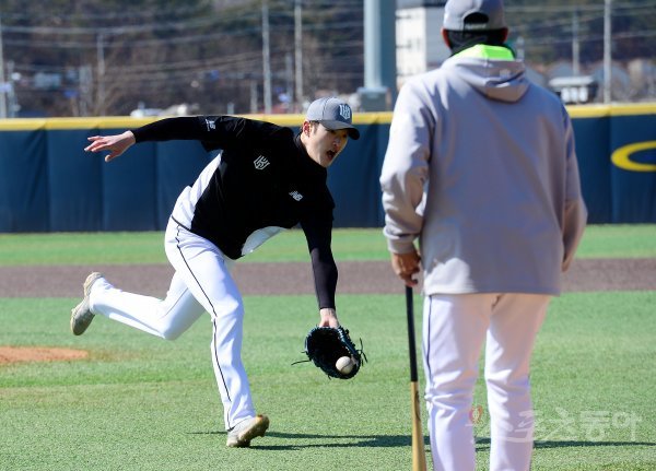 21일 부산 기장 현대차드림볼파크에서 kt가 2022시즌 스프링캠프 훈련을 펼쳤다. kt 배제성이 투수 수비훈련을 하고 있다.