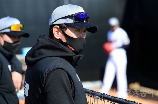 21일 부산 기장 현대차드림볼파크에서 kt가 2022시즌 스프링캠프 훈련을 펼쳤다. kt 이강철 감독이 투수들의 불펜투구를 바라보고 있다.