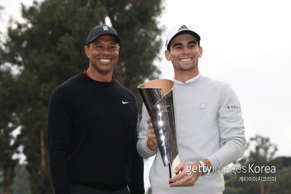 호아킨 니만(오른쪽)이 ‘와이어 투 와이어’ 우승으로 제네시스 인비테이셔널 정상에 오른 뒤 호스트를 맡은 타이거 우즈로부터 챔피언 트로피를 전달받고 환하게 웃고 있다. 사진=게티이미지코리아