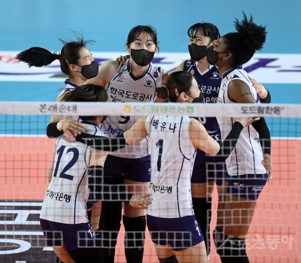 21일 대전충무체육관에서 열린 ‘2021~2022 도드람 V-리그’ 여자부 KGC인삼공사와 한국도로공사 경기에서 한국도로공사 선수들이 득점에 성공한 후 기뻐하고 있다.