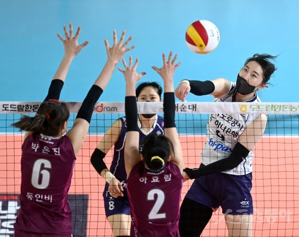 21일 대전충무체육관에서 열린 ‘2021~2022 도드람 V-리그’ 여자부 KGC인삼공사와 한국도로공사 경기에서 한국도로공사 박정아가 KGC인삼공사의 블로킹 사이로 스파이크 공격을 하고 있다.