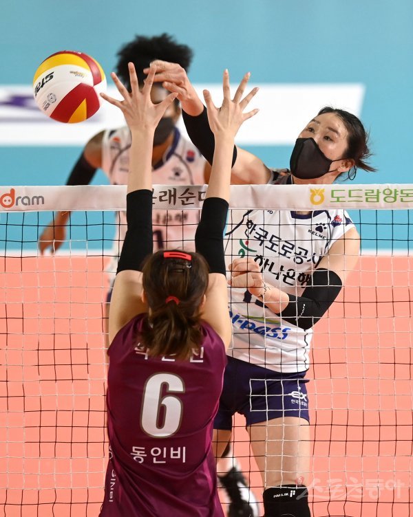 21일 대전충무체육관에서 열린 ‘2021~2022 도드람 V-리그’ 여자부 KGC인삼공사와 한국도로공사 경기에서 한국도로공사 정대영이 KGC인삼공사의 블로킹 사이로 스파이크 공격을 하고 있다.