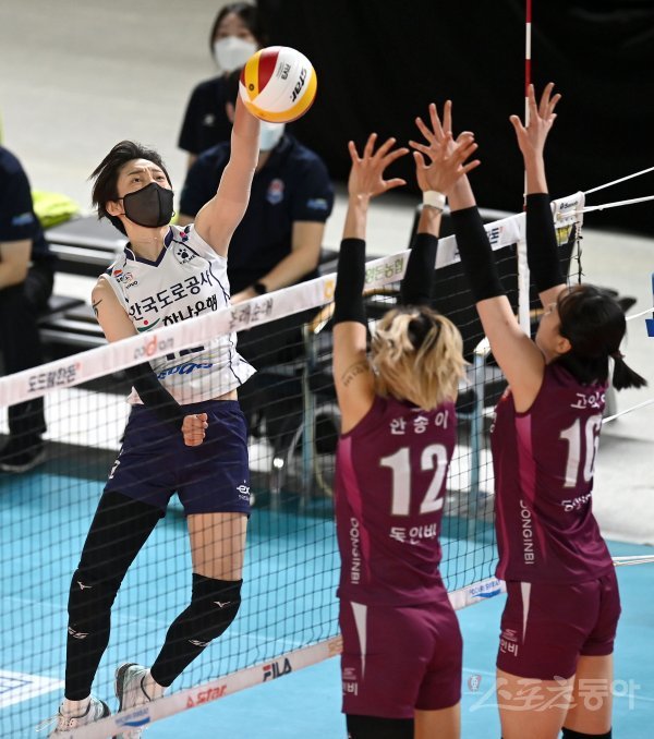 21일 대전충무체육관에서 열린 ‘2021~2022 도드람 V-리그’ 여자부 KGC인삼공사와 한국도로공사 경기에서 한국도로공사 문정원이 KGC인삼공사의 블로킹 사이로 스파이크 공격을 하고 있다.