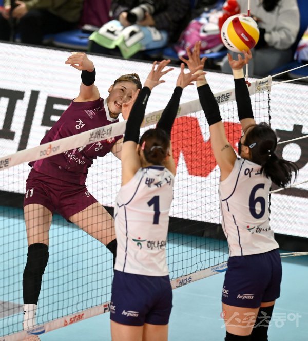 21일 대전충무체육관에서 열린 ‘2021~2022 도드람 V-리그’ 여자부 KGC인삼공사와 한국도로공사 경기에서 KGC인삼공사 박해민이 한국도로공사의 블로킹 사이로 스파이크 공격을 하고 있다.