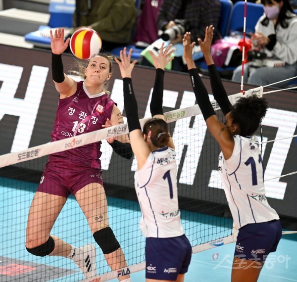21일 대전충무체육관에서 열린 ‘2021~2022 도드람 V-리그’ 여자부 KGC인삼공사와 한국도로공사 경기에서 KGC인삼공사 엘레나가 한국도로공사의 블로킹 사이로 스파이크 공격을 하고 있다.