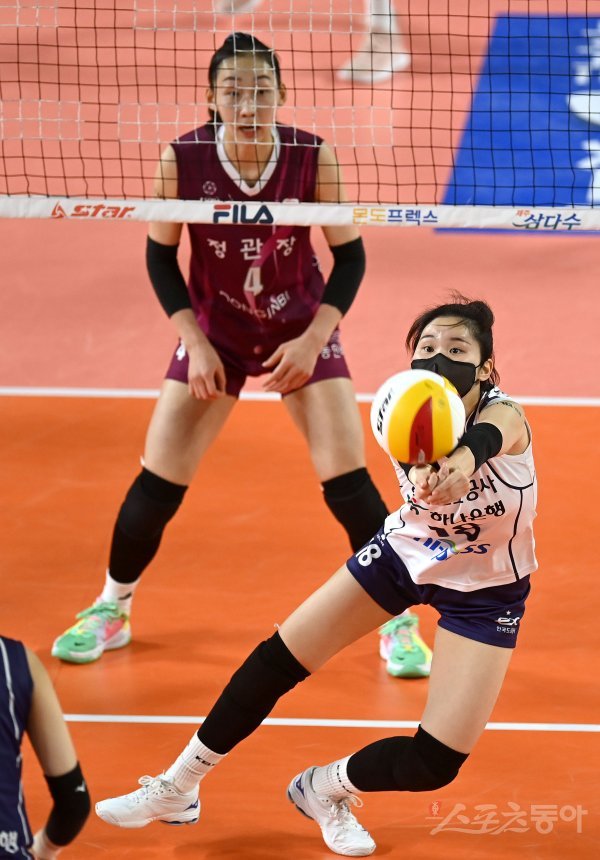 21일 대전충무체육관에서 열린 ‘2021~2022 도드람 V-리그’ 여자부 KGC인삼공사와 한국도로공사 경기에서 한국도로공사 이윤정이 디그에 성공하고 있다.