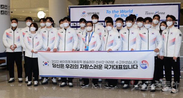 21일 인천국제공항 2터미널에서 열린 ‘2022 제24회 베이징동계올림픽대회’ 귀국 행사에서 봅슬레이 대표팀 선수들이 기념 촬영을 하고 있다.