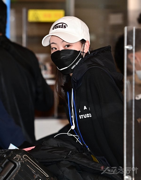 21일 인천국제공항 2터미널에서 열린 ‘2022 제24회 베이징동계올림픽대회’ 귀국 행사에서 해설위원 곽민정이 취재진을 향해 인사하고 있다.