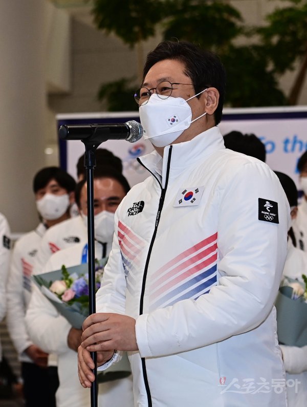 21일 인천국제공항 2터미널에서 열린 ‘2022 제24회 베이징동계올림픽대회’ 귀국 행사에서 황희 문화체육관광부 장관이 환영사를 하고 있다.