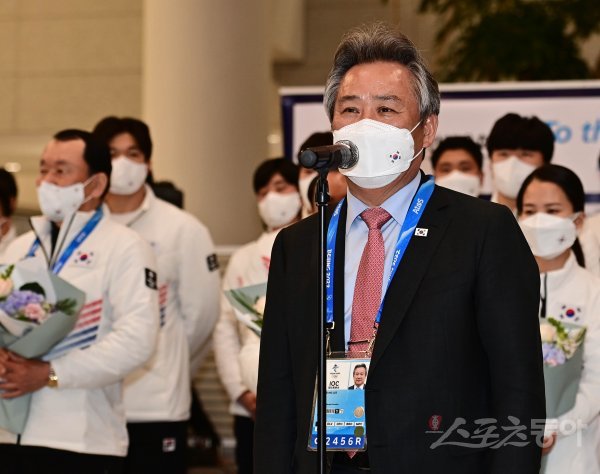 21일 인천국제공항 2터미널에서 열린 ‘2022 제24회 베이징동계올림픽대회’ 귀국 행사에서 이기흥 대한체육회장이 환영사를 하고 있다.