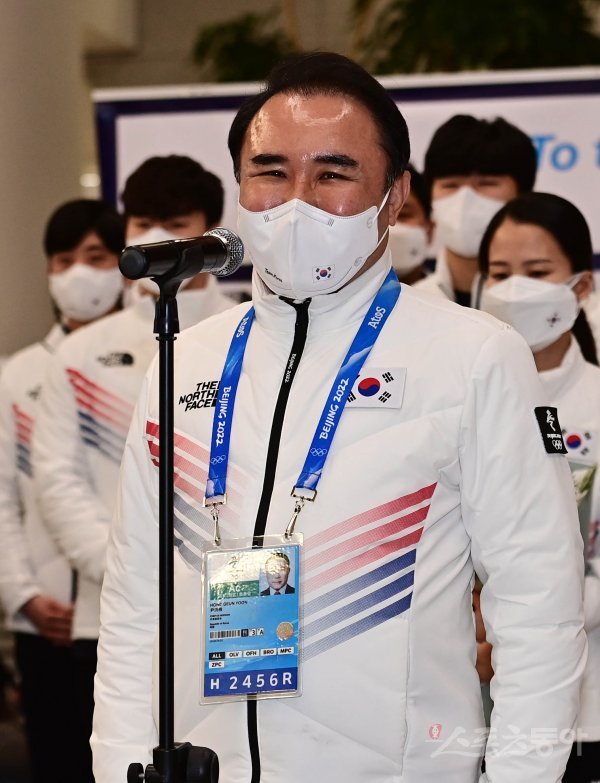 21일 인천국제공항 2터미널에서 열린 ‘2022 제24회 베이징동계올림픽대회’ 귀국 행사에서 윤홍근 선수단장이 감사 인사를 말하고 있다.
