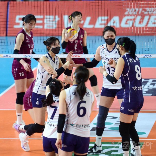 21일 대전충무체육관에서 열린 ‘2021~2022 도드람 V-리그’ 여자부 KGC인삼공사와 한국도로공사 경기에서 세트스코어 3-1 승리를 거둔 한국도로공사 선수들이 기뻐하고 있다.