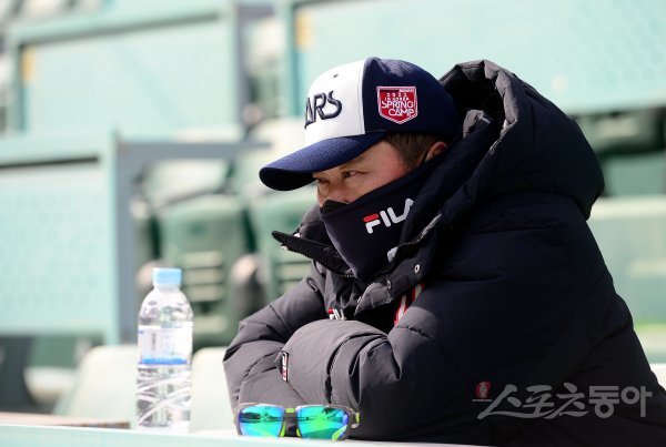 22일 울산 문수야구장에서 두산이 2022시즌 스프링캠프 훈련을 가졌다. 두산 김태형 감독이 관중석에서 선수들의 훈련을 지켜보고 있다.