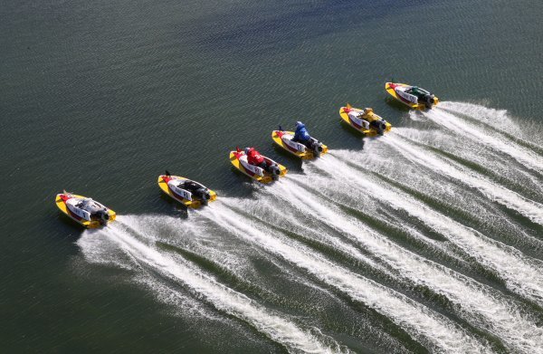 미사리 경정장에서 출전 선수들이 경주를 펼치고 있다. 최근 경주에서 팬들의 분석을 뒤집는 이변이 종종 발생해 고배당을 탄생시키고 있다.