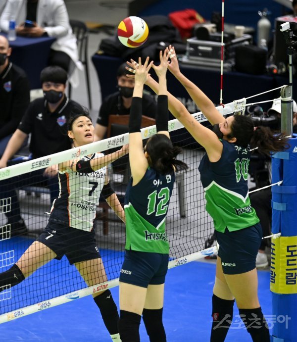 22일 수원체육관에서 열린 ‘2021~2022 도드람 V-리그’ 여자부 현대건설과 IBK기업은행 경기에서 IBK기업은행 김주향이 현대건설의 블로킹 사이로 밀어넣기 공격을 하고 있다.