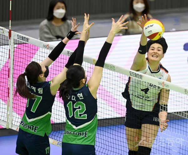 22일 수원체육관에서 열린 ‘2021~2022 도드람 V-리그’ 여자부 현대건설과 IBK기업은행 경기에서 IBK기업은행 김희진이 현대건설의 블로킹 사이로 스파이크를 날리고 있다.