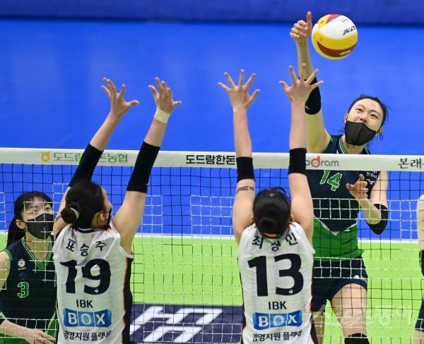22일 수원체육관에서 열린 ‘2021~2022 도드람 V-리그’ 여자부 현대건설과 IBK기업은행 경기에서 현대건설 양효진이 IBK기업은행의 블로킹 사이로 스파이크를 날리고 있다.