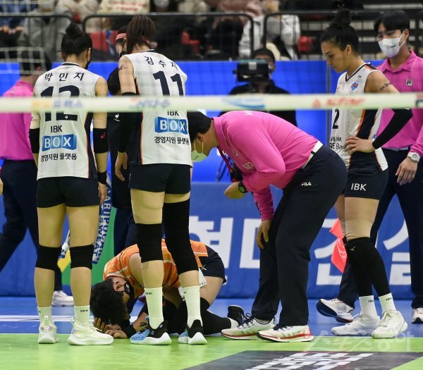 22일 수원체육관에서 열린 ‘2021~2022 도드람 V-리그’ 여자부 현대건설과 IBK기업은행 경기에서IBK기업은행 신연경이 수비 중 부상을 당해 고통스러워하고 있다.