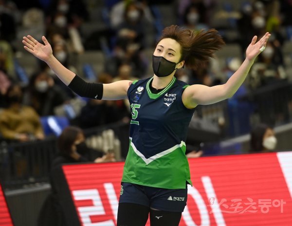 22일 수원체육관에서 열린 ‘2021~2022 도드람 V-리그’ 여자부 현대건설과 IBK기업은행 경기에서 현대건설 황민경이 공격 득점에 성공한 후 기뻐하고 있다.