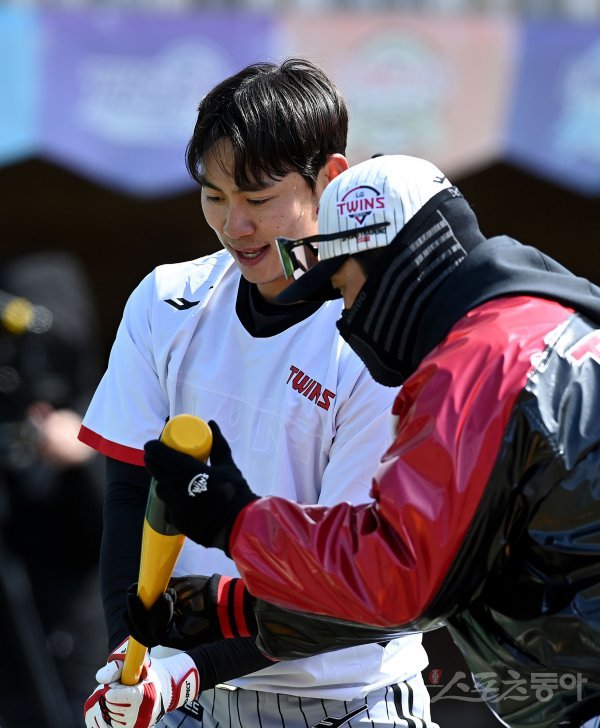 23일 경남 통영 산양스포츠파크에서 LG가 2022시즌 스프링캠프 훈련을 가졌다. LG 한석현이 이호준 코치의 지도를 받고 있다.