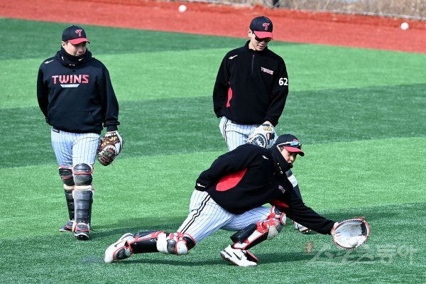 23일 경남 통영 산양스포츠파크에서 LG가 2022시즌 스프링캠프 훈련을 가졌다. LG 유강남이 포수 훈련을 펼치고 있다.