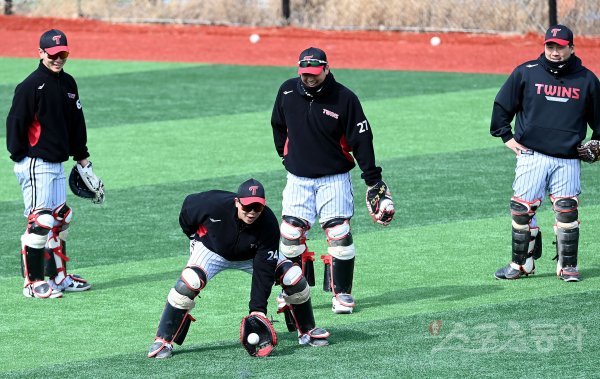 23일 경남 통영 산양스포츠파크에서 LG가 2022시즌 스프링캠프 훈련을 가졌다. LG 박재욱이 포수 훈련을 펼치고 있다.