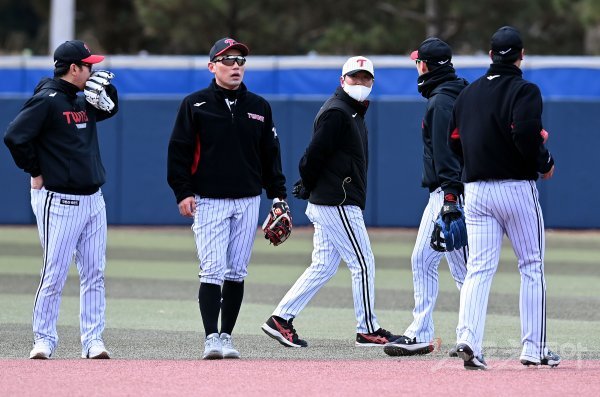 23일 경남 통영 산양스포츠파크에서 LG가 2022시즌 스프링캠프 훈련을 가졌다. LG 류지현 감독이 선수들의 훈련을 지켜보고 있다.