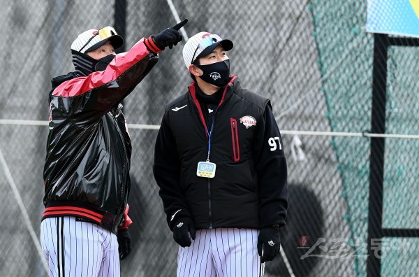 23일 경남 통영 산양스포츠파크에서 LG가 2022시즌 스프링캠프 훈련을 가졌다. LG 이호준, 모창민 코치가 훈련을 지켜보고 있다.