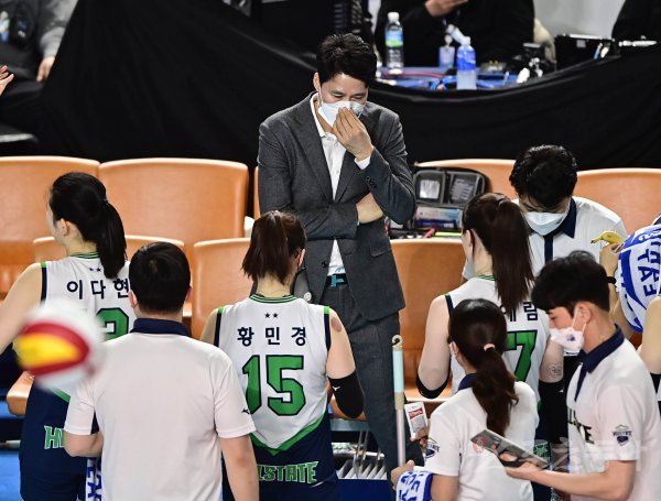23일 경북 김천실내체육관에서 열린 ‘2021~2022 도드람 V-리그’ 여자부 김천 한국도로공사와 수원 현대건설의 경기에서 현대건설 강성형 감독이 1세트를 내준 뒤 생각에 잠겨 있다.