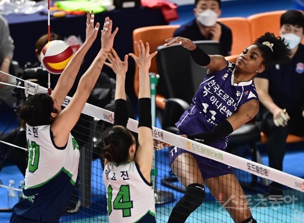 23일 경북 김천실내체육관에서 열린 ‘2021~2022 도드람 V-리그’ 여자부 김천 한국도로공사와 수원 현대건설의 경기에서 한국도로공사 켈시가 현대건설 블로커 앞에서 스파이크를 하고 있다.