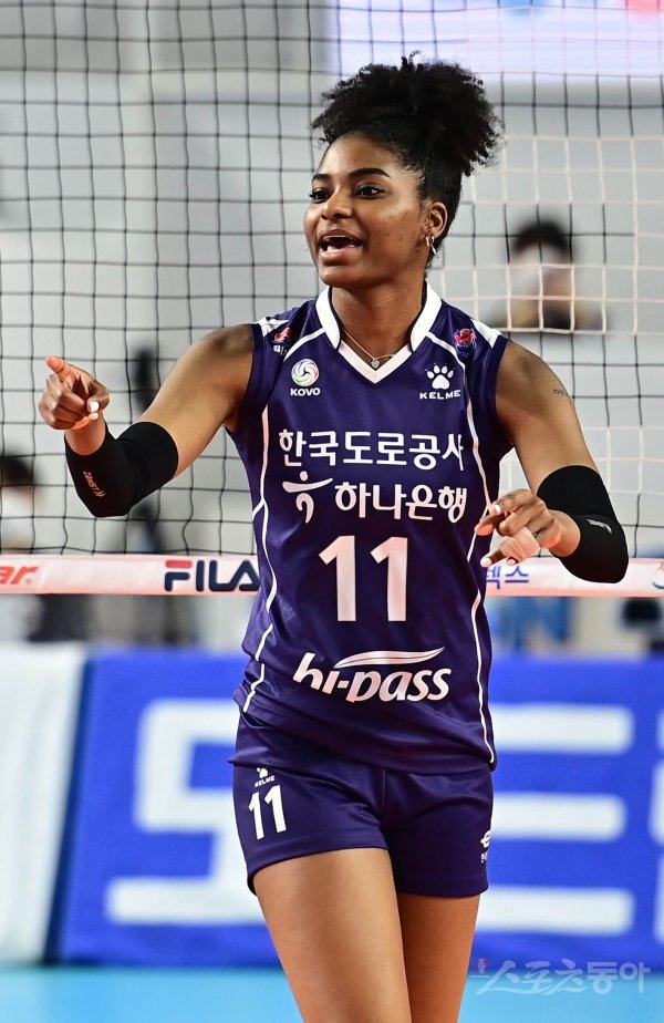 23일 경북 김천실내체육관에서 열린 ‘2021~2022 도드람 V-리그’ 여자부 김천 한국도로공사와 수원 현대건설의 경기에서 한국도로공사 켈시가 득점에 성공한 후 기뻐하고 있다.