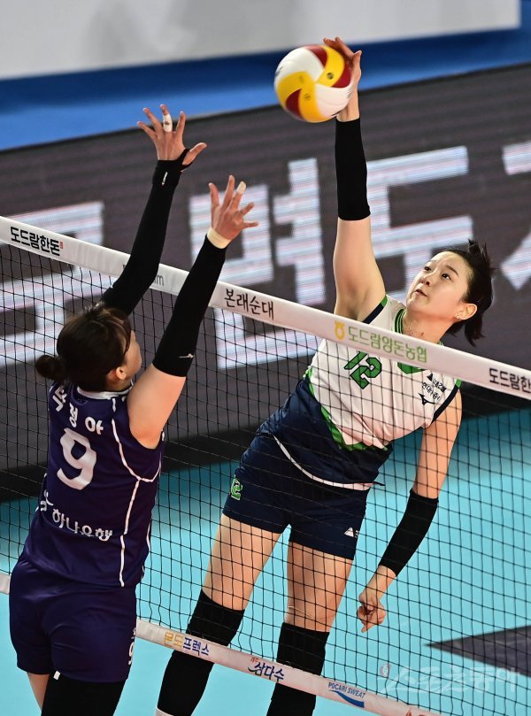 23일 경북 김천실내체육관에서 열린 ‘2021~2022 도드람 V-리그’ 여자부 김천 한국도로공사와 수원 현대건설의 경기에서 현대건설 이다현이 한국도로공사 블로커 앞에서 스파이크를 하고 있다.