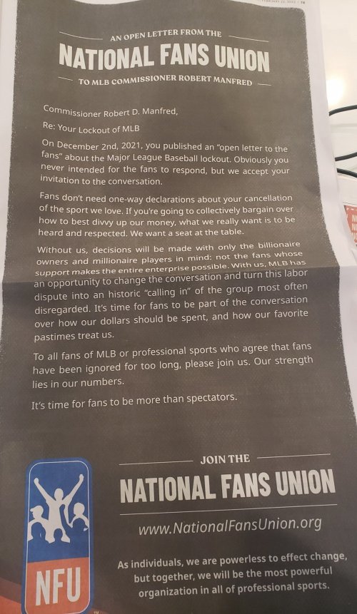 22일(현지시간) 미국 밀워키 주 지역 언론인 ‘밀워키 저널 센티널’의 지면에 이색 전면 광고가 게재됐다. 광고는 ‘NFU’(National Fans Union)라는 단체 명의로 롭 맨프레드 메이저리그 커미셔너에게 보내는 편지 형식을 띄고 있다.
