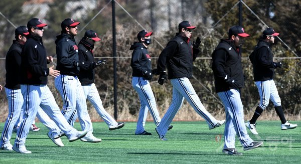 24일 경남 통영 산양스포츠파크에서 LG가 2022시즌 스프링캠프 훈련을 가졌다. LG 선수들이 훈련에 앞서 몸을 풀고 있다.