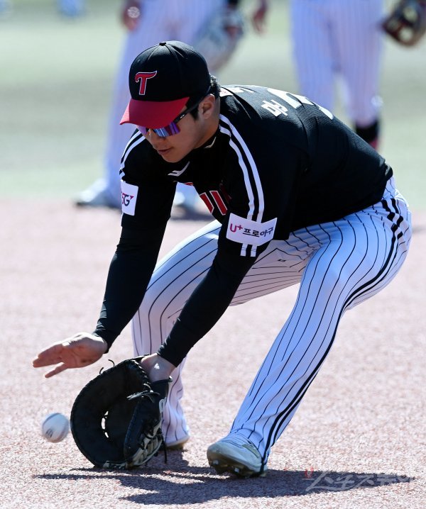 24일 경남 통영 산양스포츠파크에서 LG가 2022시즌 스프링캠프 훈련을 가졌다. LG 문보경이 1루 수비를 훈련하고 있다.