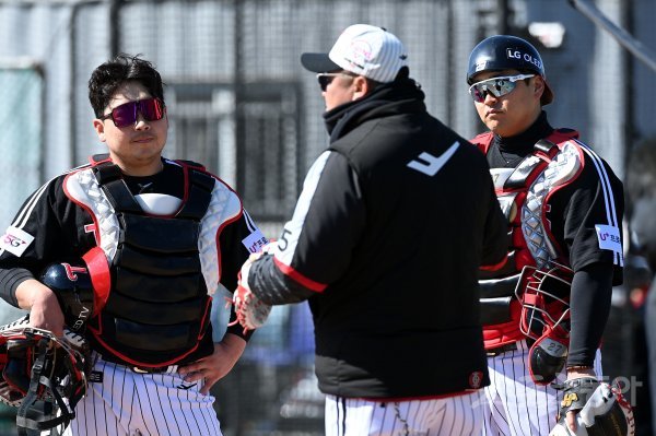 24일 경남 통영 산양스포츠파크에서 LG가 2022시즌 스프링캠프 훈련을 가졌다. LG 허도환과 유강남이 조인성 코치의 지도를 받고 있다.