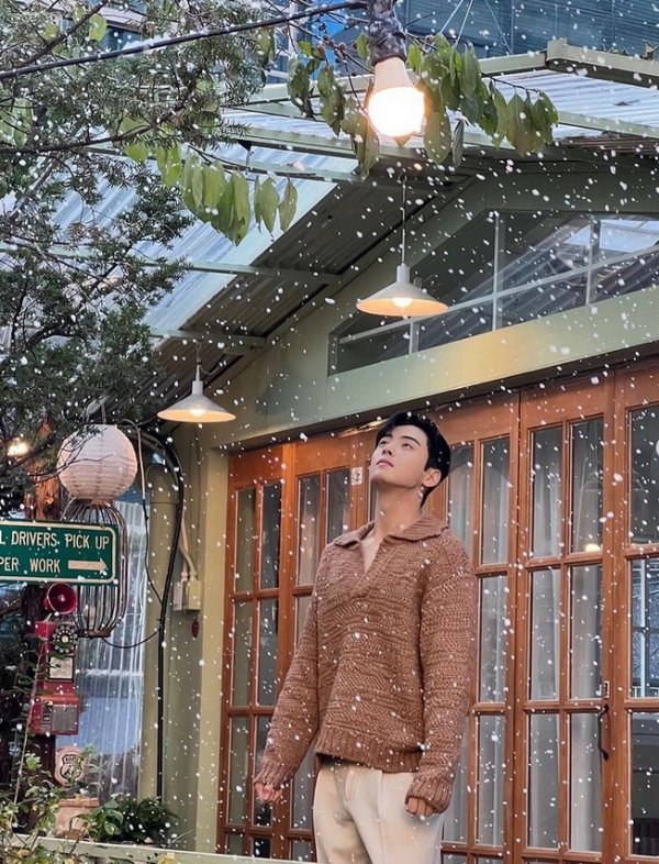함께 공개된 사진 속 차은우는 눈이 내리는 트리 옆에서 포즈를 취하고 있다. 눈 내리는 배경과 조각 같은 비주얼이 만나 영화 속 장면 같은 분위기를 자아냈다.