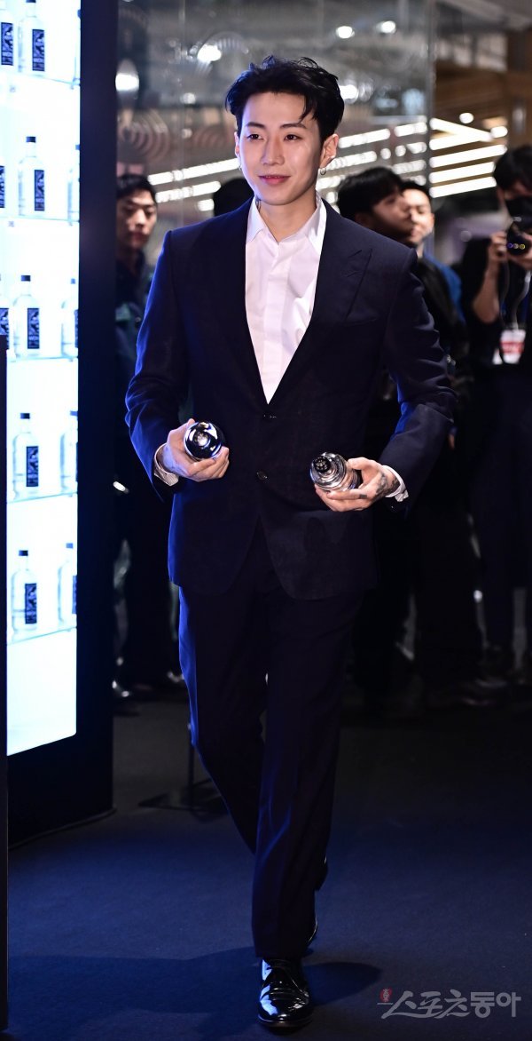래퍼 박재범이 25일 서울 영등포구 여의도동 더 현대 서울에서 열린 한 프리미엄 증류식 소주 브랜드 출시 기념 팝업 스토어 오픈 행사에 입장하고 있다.