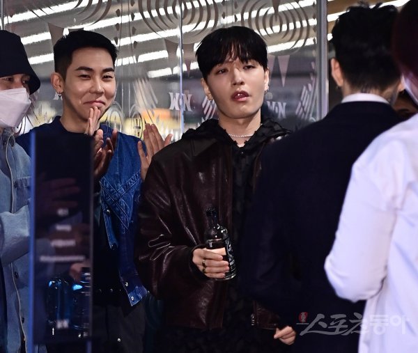 래퍼 로꼬가 25일 서울 영등포구 여의도동 더 현대 서울에서 열린 한 프리미엄 증류식 소주 브랜드 출시 기념 팝업 스토어 오픈 행사에서 손뼉을 치고 있다.