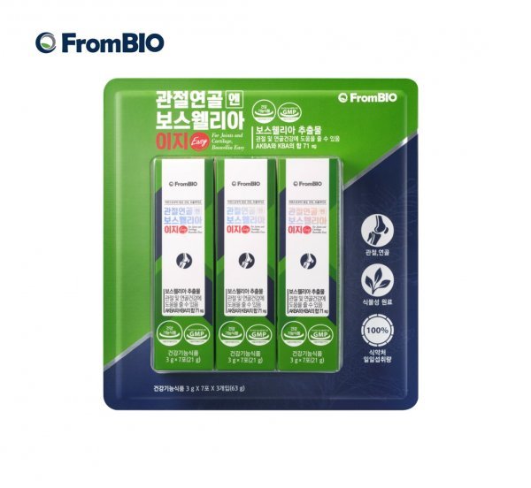 ‘관절연골엔 보스웰리아 이지’는 관절 및 연골건강에 도움을 줄 수 있음의 기능성 인증을 받은 보스웰리아 추출물이 주원료인 관절건강 건간기능식품이다. 간편하게 섭취가 가능하도록 분말 제형으로 마련됐다. 창고형 할인마트에 입점하는 제품은 7포씩 3개의 블리스터로 포장했다.