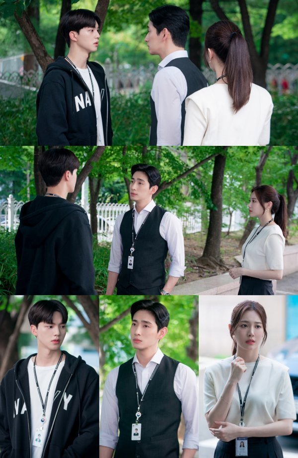 이 어색하고도 불편한 대면을 무려 세 명이 함께 한다면 어떨까. 26일 5회 방송에 앞서 제작진이 공개한 스틸 컷에는 시우, 기준, 유진 사이에 껄끄러운 삼자대면이 이뤄지는 듯하다. 날 선 표정을 하는 세 사람 사이 감도는 은근한 신경전은 긴장감을 폭발시킨다. 마주쳐서 좋을 것 하나 없는 세 사람이 이렇게 얼굴을 맞대고 으르렁대는 그 배경에도 궁금증이 쏠린다.
