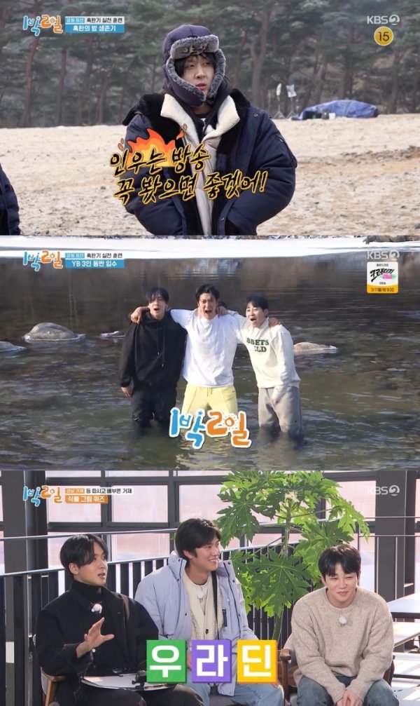 라비는 딘딘, 나인우와 점심 식사를 얻기 위해 걸었던 입수에 나섰다. \'1박 2일\' 촬영 3년 만에 첫 입수에 도전하게 된 라비는 "의미 있는 순간에 입수하는 것 같아서 열심히 파이팅해서 다녀오겠다"고 각오를 밝혔다.
