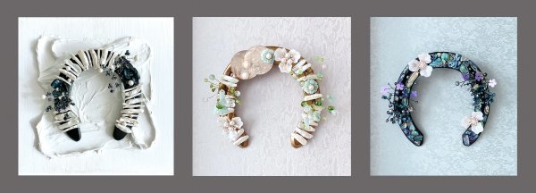 초대전 출품 작품, 왼쪽부터 ‘밤의 눈꽃‘, ‘보름달‘, ‘자개정원‘ 편자, 자개, 비즈 등. 사진 | 한국마사회