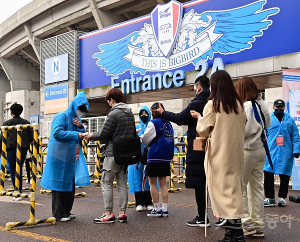 1일 수원월드컵경기장에서 열린 ‘하나원큐 K리그1 2022’ 수원 삼성과 제주 유나이티드의 경기에서 정부 지침으로 출입명부제도와 방역패스가 중단돼 관중들이 QR코드 인식 없이 체온 체크를 하고 있다.