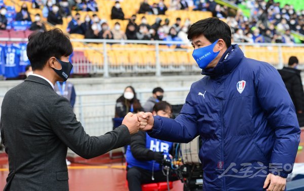 1일 수원월드컵경기장에서 열린 ‘하나원큐 K리그1 2022’ 수원 삼성과 제주 유나이티드의 경기에 앞서 수원 박건하 감독이 제주 남기일 감독과 주먹 인사를 하고 있다.