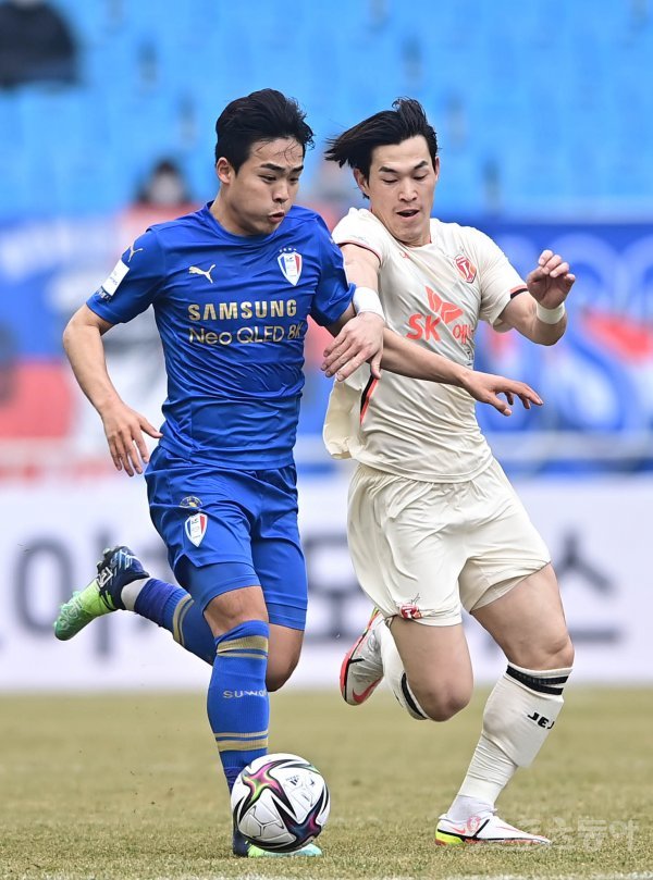 1일 수원월드컵경기장에서 열린 ‘하나원큐 K리그1 2022’ 수원 삼성과 제주 유나이티드의 경기에서 수원 강현묵과 제주 이창민이 몸싸움을 하고 있다.