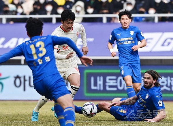 1일 수원월드컵경기장에서 열린 ‘하나원큐 K리그1 2022’ 수원 삼성과 제주 유나이티드의 경기에서 제주 김주공이 수원 불투이스의 수비를 뚫고 드리블 돌파하고 있다.
