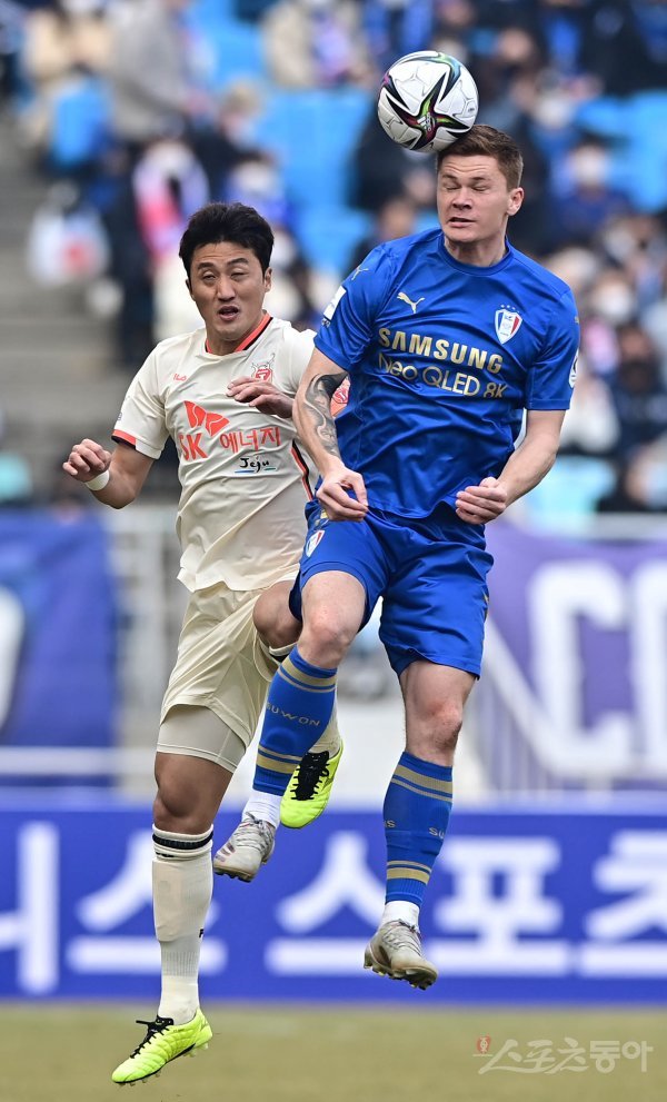 1일 수원월드컵경기장에서 열린 ‘하나원큐 K리그1 2022’ 수원 삼성과 제주 유나이티드의 경기에서 수원 그로닝이 헤딩을 하고 있다.
